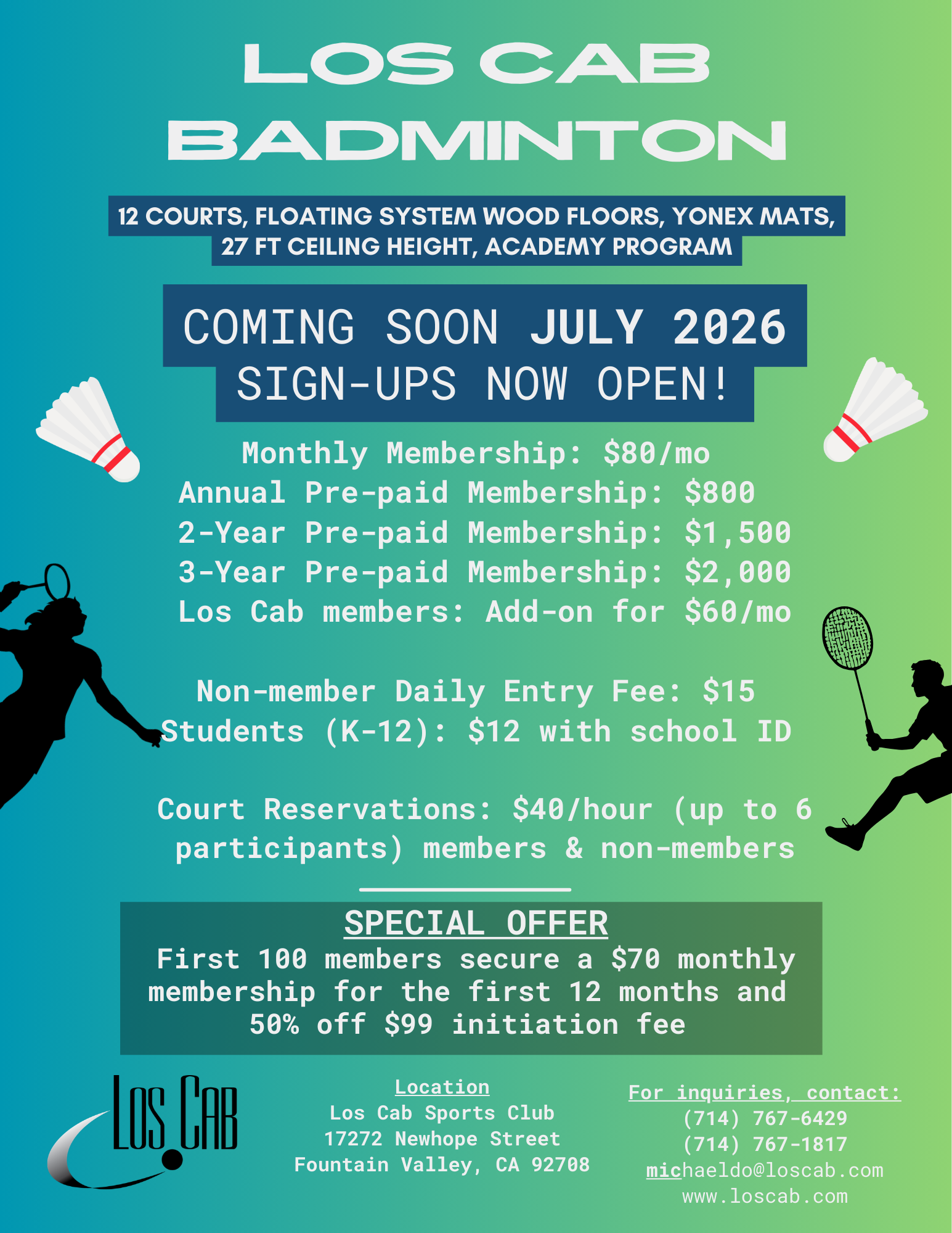 Badminton is coming to Los Cab!!!! .ts-button-wrapper a.ts-button-1{background:#1aa3b2;border-color:#cccccc;border-width:0px ;color:#000000;}.ts-button-wrapper a.ts-button-1:hover{background:#1aa3b2;border-color:#000000;color:#ffffff;}CLICK HERE TO BE ADDED TO THE INTEREST LIST!