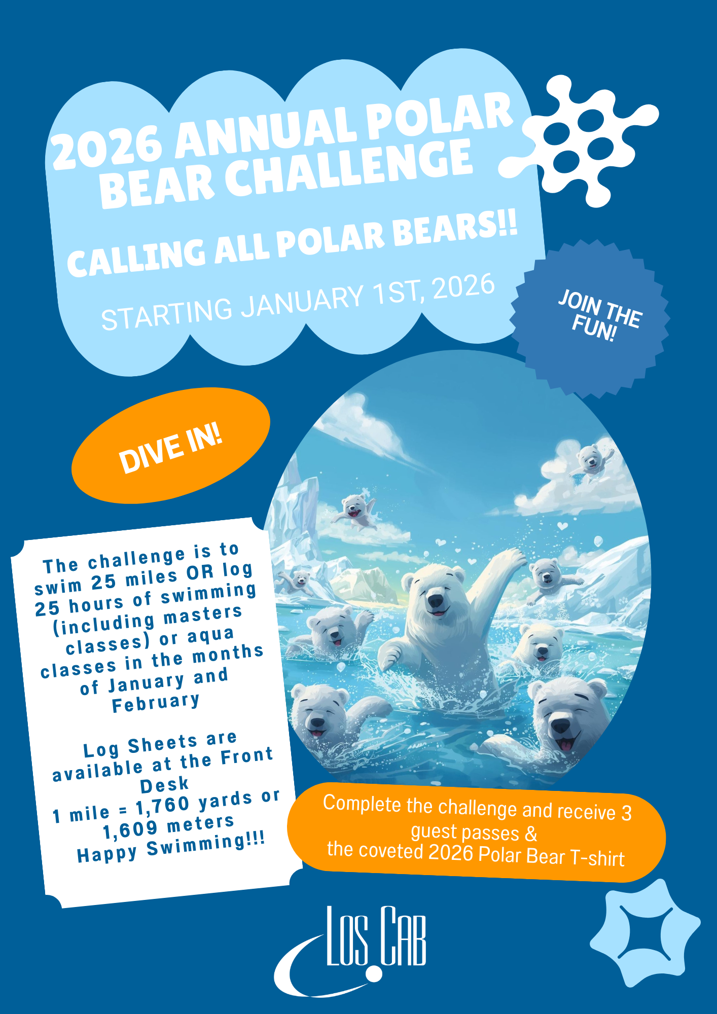 Our annual Polar bear swim/aqua challenge started January 1 and runs through February 28. Swim (Aqua fitness classes do count) 25 miles or hours to complete the challenge. Log sheets are located at the front desk. Guest passes and the coveted 2026 Polar Bear t-shirt will be awarded to all who complete the challenge.