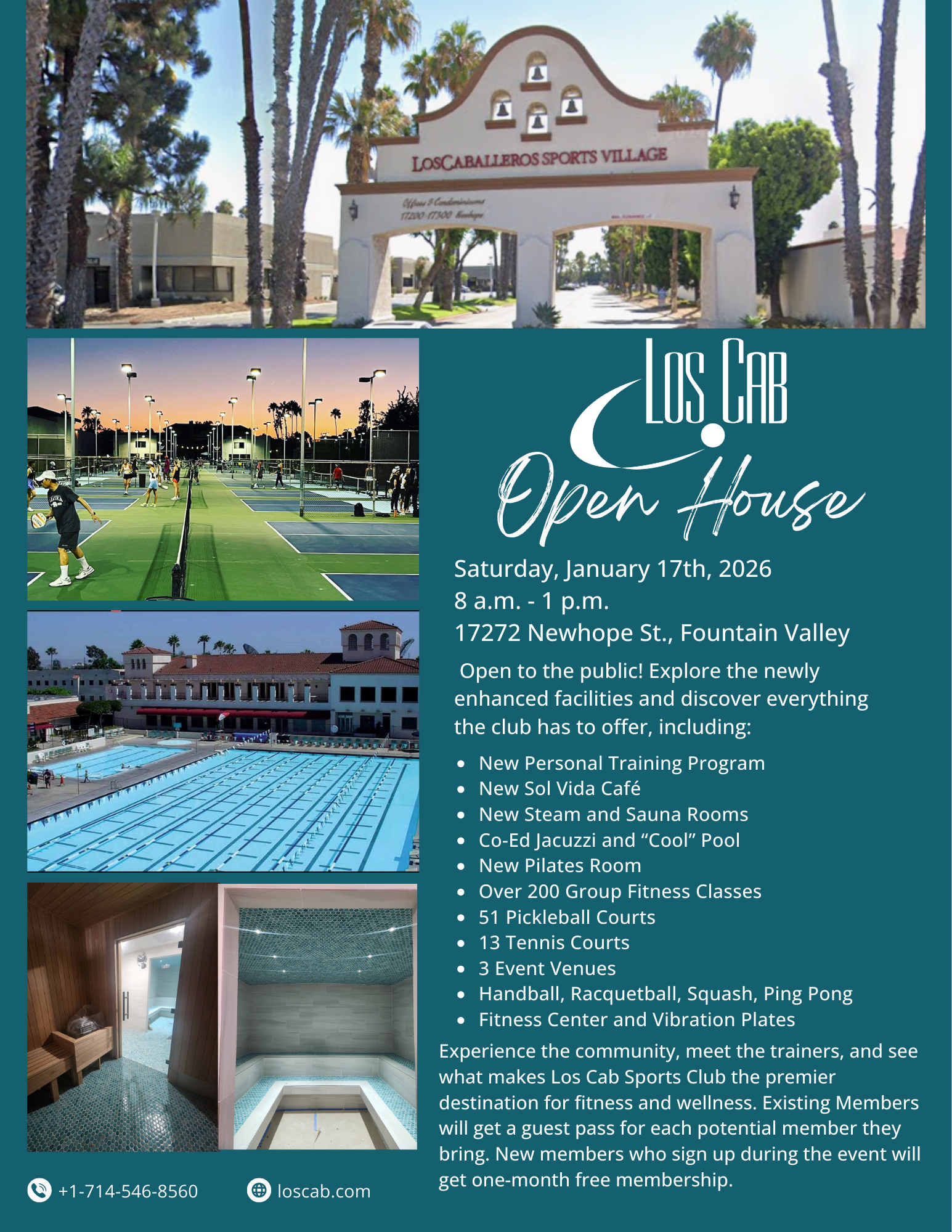 Saturday, January 17th from 8am to 1pm we will be hosting an open house to debut all the new amenities around the club. Our new café will be there with sneak peak of some of her tasty nibbles and drinks for purchase. Our new personal training team will be available to give you information on the relaunch of the program, along with the various groups that make Los Cab the place to be. We’ll be giving any member that brings a prospective member to the event a free guest pass. This event will also be open to the public. We’ll be doing group tours for all, come find out everything Los Cab has to offer so you can take full advantage of your membership.