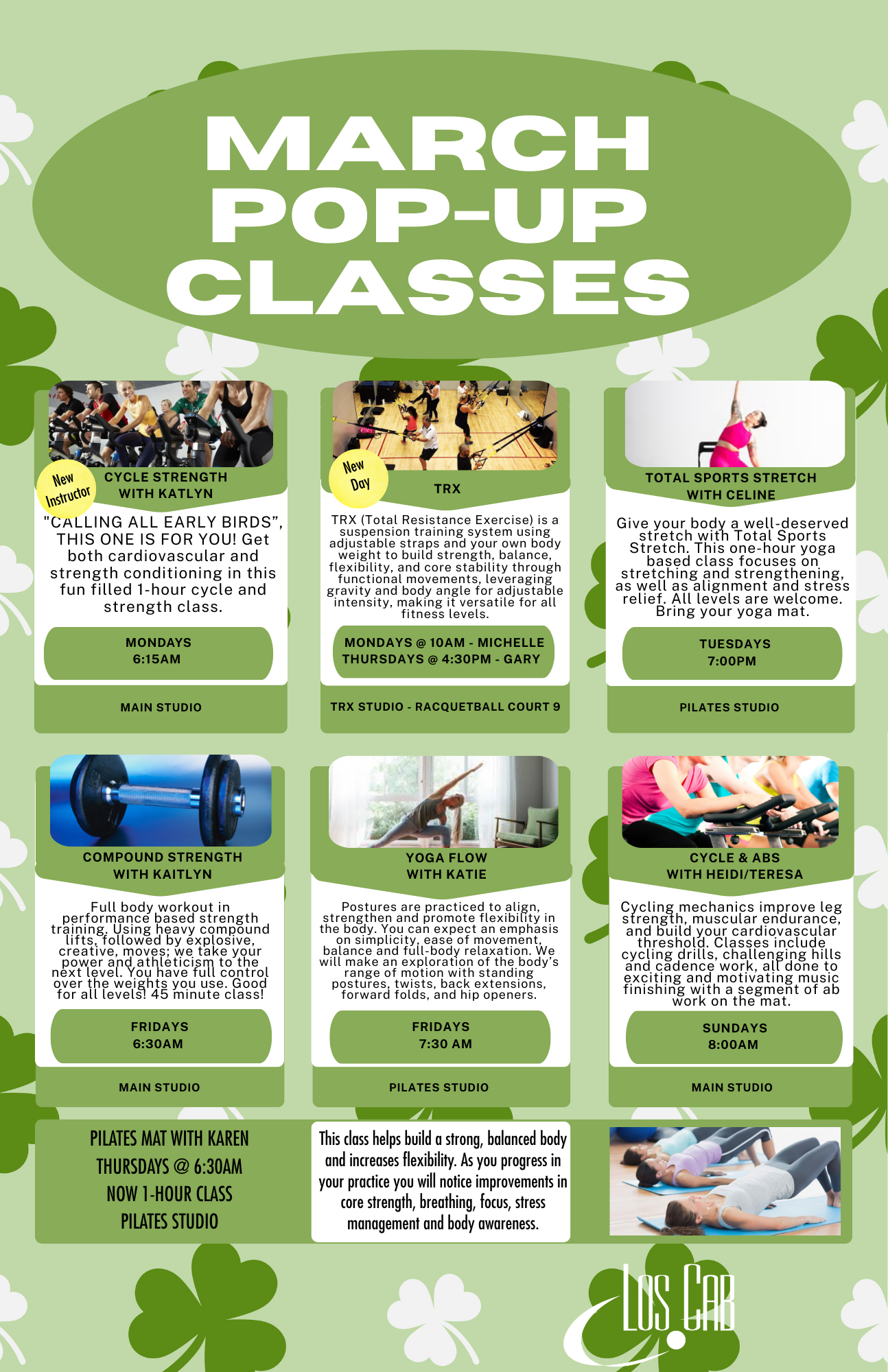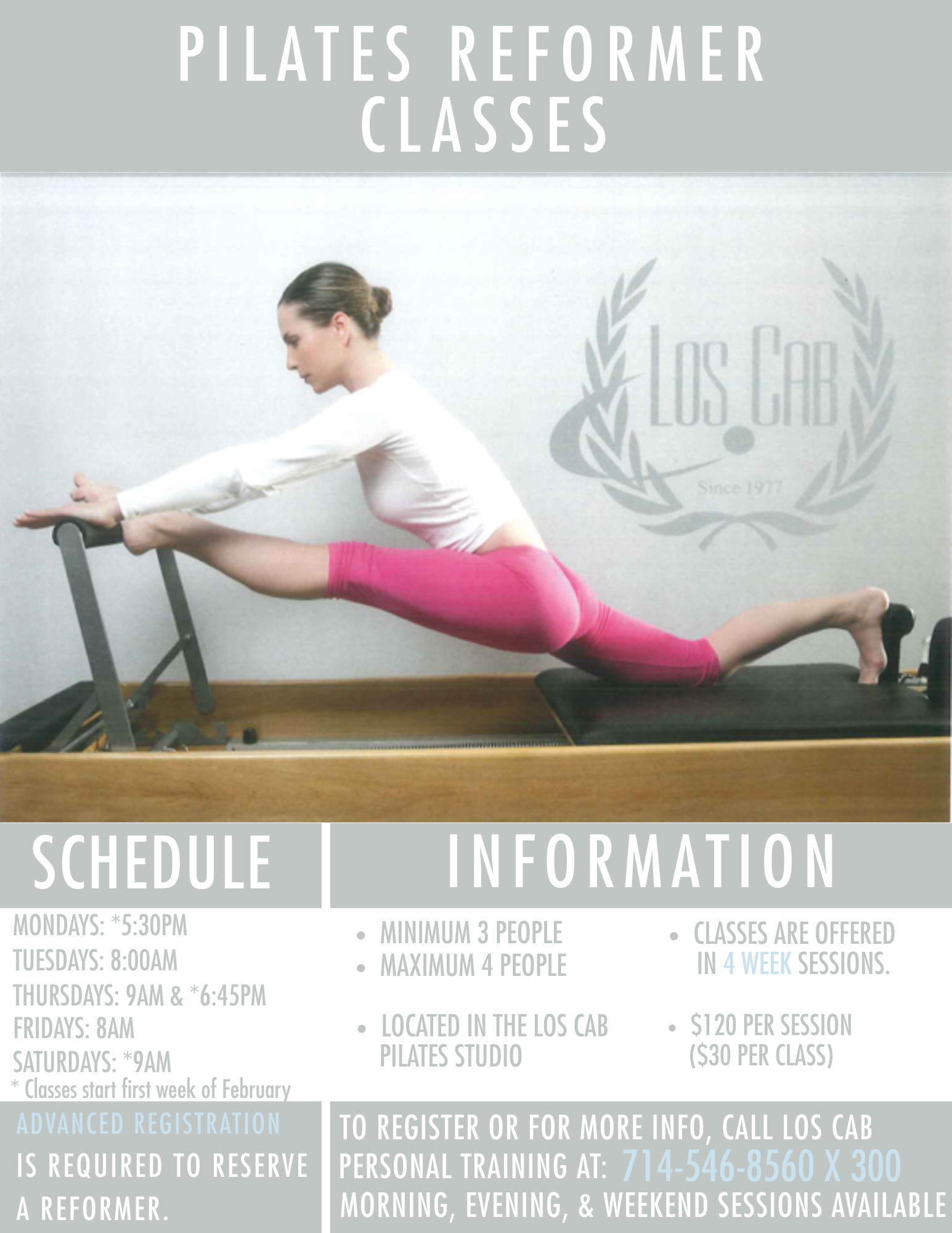 Starting Saturday, January 10th the Pilates studio will reopen. We still have a few final touches to add to the room. All classes that were in the pool view room will move over to the Pilates Studio. It’s located by the back “cool” pool.